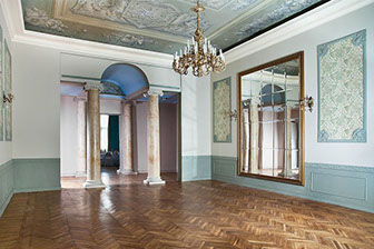 Усадьба совмещает в себе элегантность и изысканность. В отделке залов использованы эксклюзивные материалы – паркет из дорогих пород дерева, горного хрусталя зеркал всё это создаёт атмосферу роскоши и величия в усадьбе Строгановых. Стены украшают бра в стиле ампир и завершает ансамбль большая люстра в центре зала.